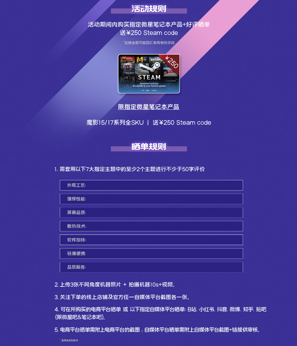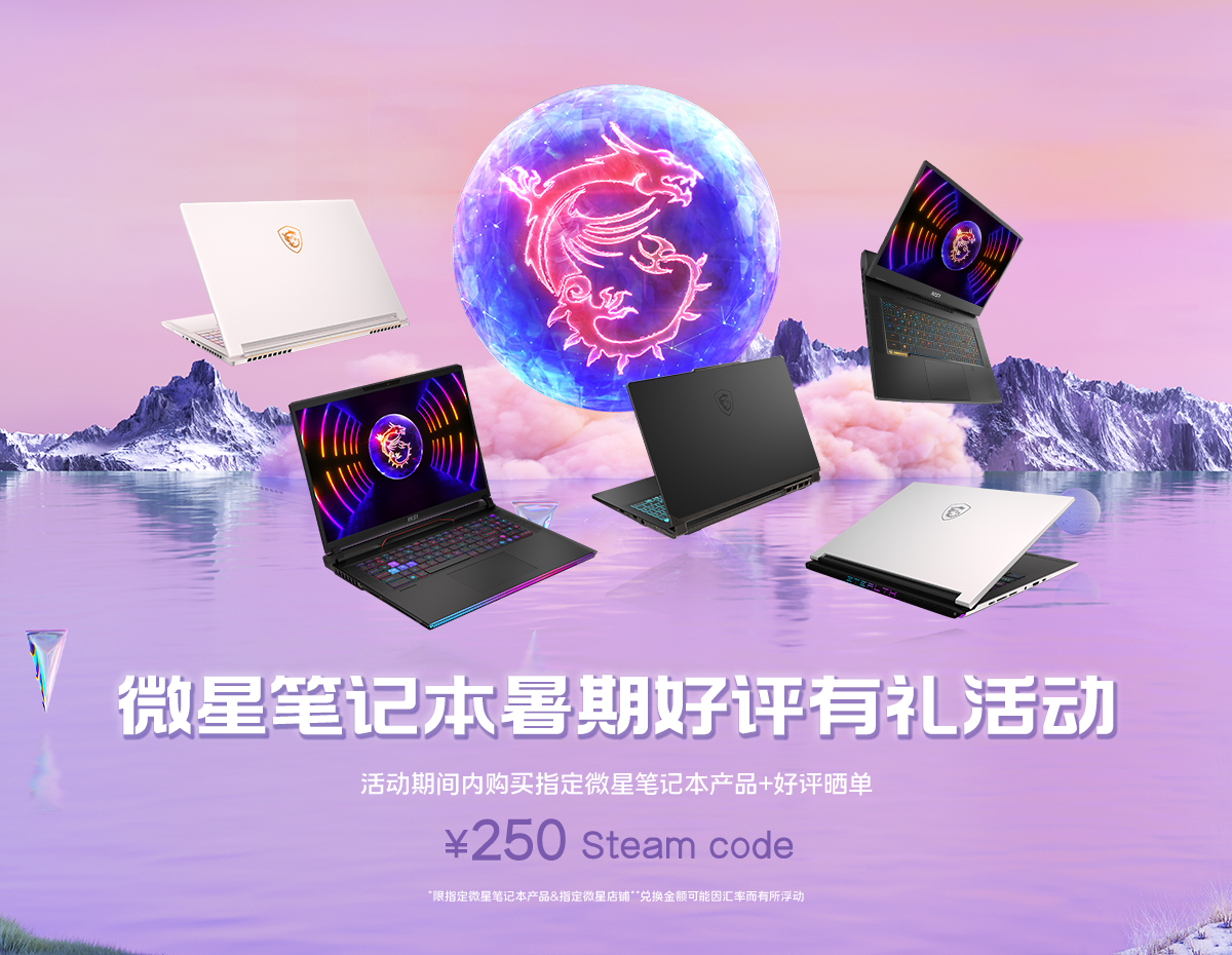 与此同时,魔影15、魔影17全系各类配置都可参加最新一波的好评有礼活动:活动期间内购买指定微星笔记本产品,完成在所购买的电商平台晒单 或 以下指定自媒体平台晒单:B站、小红书、抖音、微博、知乎、贴吧(限微星吧&笔记本吧),就有机会拿到¥250 Steam code兑换券。