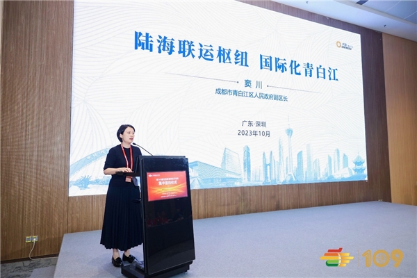 随后,成都市青白江区人民政府副区长窦川推介了作为国际化的陆海联运枢纽的青白江区。她介绍到,近年来我们积极主动服务和融入“一带一路”、成渝地区双城经济圈、“双循环”新发展格局等国家战略,充分发挥我们陆港枢纽的引擎作用,着力发展进出口贸易,辐射带动区域经济高质量发展,成为促进成都推动新一轮高水平对外开放,助力四川加快构筑向西开放的战略高地与参与国际竞争新经济的重要力量。她热忱邀请各类进口特色消费品代理商企业到青白江开展贸易业务,参与到青白江开放的热潮中来,诚邀全国企业相约青白江,相聚在第110届全国糖酒会。