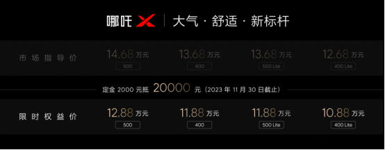而价格方面,在广州车展上订车的用户也赶上了,哪吒X在12.68万元-14.68万元的指导价基础上,为首批下定用户推出至高价值33000元的满配用户权益,11月底前下定,可享受2000元定金最高抵20000元,相当于最低10.88万元,即可把哪吒X带回家,如果选择可以选装智驾包和舒享包的500版,那11月买也才13.88万元,相当划算。敲黑板划重点,哪吒X的限时权益只在11月30日前才能享受,赶紧锁定。