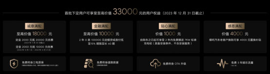 此外,还有两年零息十万定额贷或首付低至15%的金融满配权益、购车之日起可享受两年内免费赠送7kW标准充电桩的贴心满配权益、老客户4000元购车置换补贴的感恩满配权益、以及诚意满满的服务承诺,包括免费终身三电质保、免费终身道路救援、免费终身OTA升级、免费3年每月5G娱乐流量,多重力度空前的权益,错过了可比错过双十一还难受。