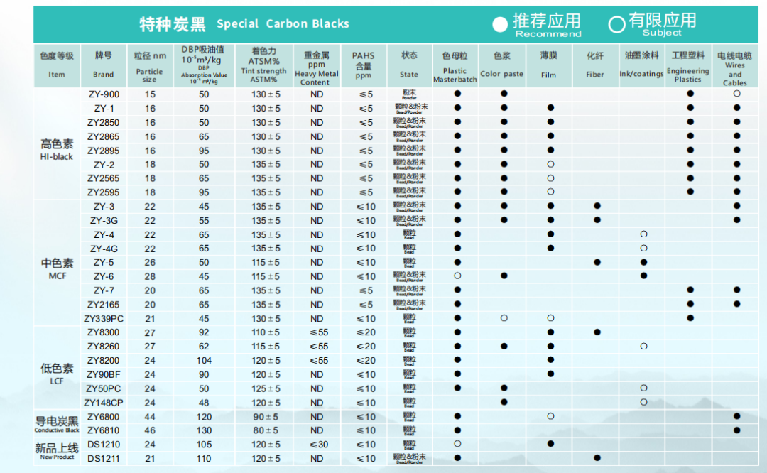 ●炭黑产品: 混气炭黑:ZY-611、ZY-311 色素炭黑:ZY900丶ZY-1、ZY-2、ZY-3、ZY-4、ZY-5、ZY-6、ZY-7、ZY90BF、ZY268、ZY-8200等、混气炭黑、ZY-611、ZY-311、热裂法炭黑(N990)等 橡胶用炭黑:N110、N330、N326、N375、N220、N234、N550、N539、N660、N774、天然气半补强炭黑。