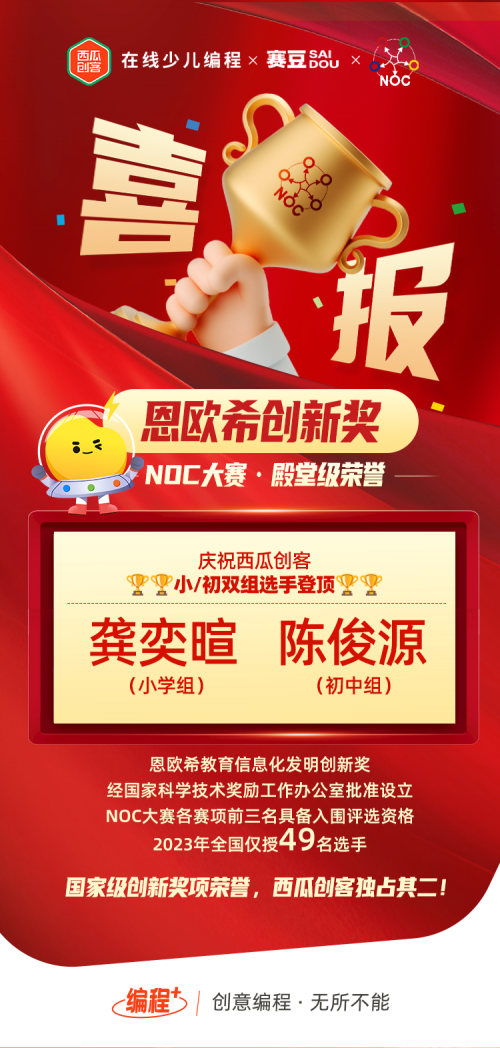 同时,由编程社区共创世界发起的 Game Jam 也是中国迄今为止最大规模的限时编程作品挑战活动。还有2位小学员的科创作品,拿到了NOC大赛的最高奖——恩欧希教育信息化发明创新奖,今年全国一共只有49人,西瓜占2席。