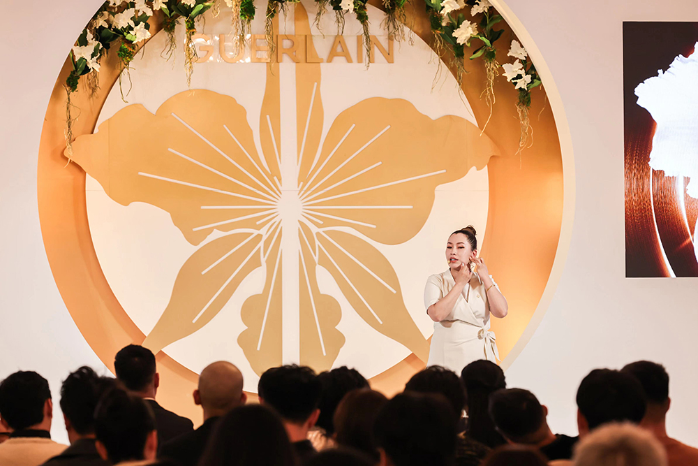 图:法国娇兰资深美容师Vivian Li带领大家进入御廷兰花金致焕采系列的至臻仪典