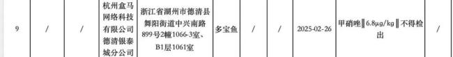 4月25日,湖州市市场监督管理局发布食品安全监督抽检信息通告(2025年第5期),指出杭州盒马网络科技有限公司德清银泰城分公司销售的多宝鱼中甲硝唑含量不符合食品安全国家标准规定。