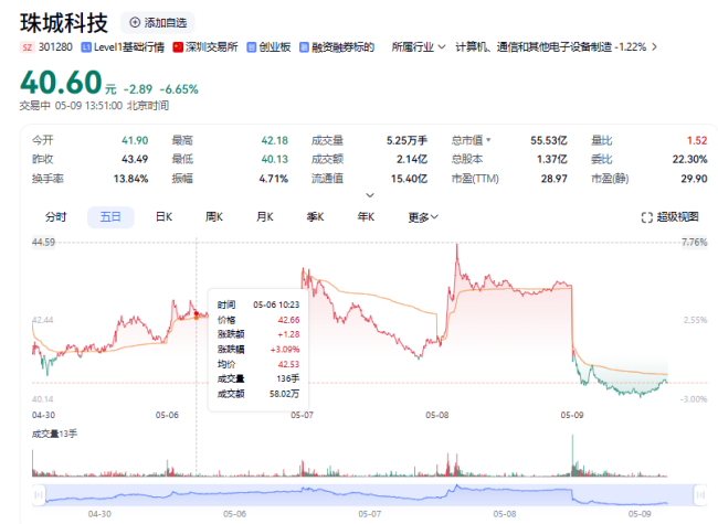 二级市场上,截至5月8日收盘,珠城科技股价报43.49元/股,总市值约为59.49亿元。经计算,876.75万股股票对应市值约为3.81亿元。
