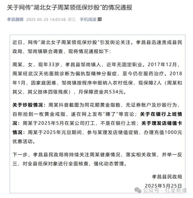 5月25日,湖北孝感孝昌县民政局发布关于网传“湖北女子周某领低保炒股”的情况通报。近日,该事件引发舆论关注,孝昌县迅速责成县民政局和邹岗镇进行联合调查。