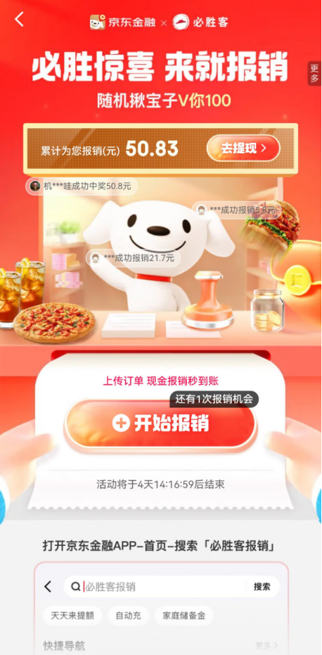 除了支付满减,京东金融还打造了“必胜客报销”,有霸王餐等你来吃。5月26日-30日不限时段,只要在京东金融App或京东App搜索“必胜客报销”,上传吃必胜客的相关照片,就有机会拿到现金报销,甚至直接免单。还有大额支付红包和美食红包可拿。