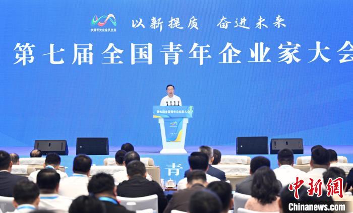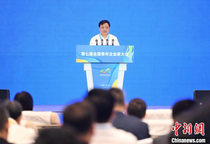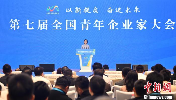 5月27日,中央统战部副部长、全国工商联党组书记沈莹致辞。当日,第七届全国青年企业家大会在浙江杭州召开。活动聚焦“以新提质 奋进未来”主题,通过创新创业经验分享,凝聚发展共识,引导青年企业家在建设现代化产业体系、推进中国式现代化中建功立业。中新社记者 王刚 摄