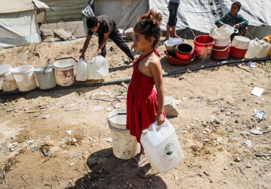 5月20日,在加沙地带北部的杰巴利耶难民营,一名巴勒斯坦女童准备打水。新华社发(马哈茂德·扎基摄)