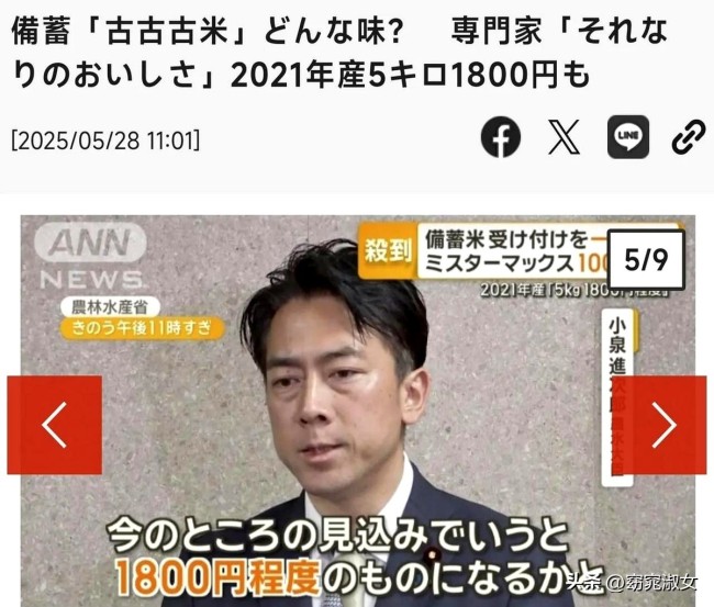 日本农业水产大臣小泉进次郎十分骄傲地宣布政府将要拿出2021年所产陈米以每5公斤1800日元的价格进行售卖(合人民币差不多1斤大米9块钱)。