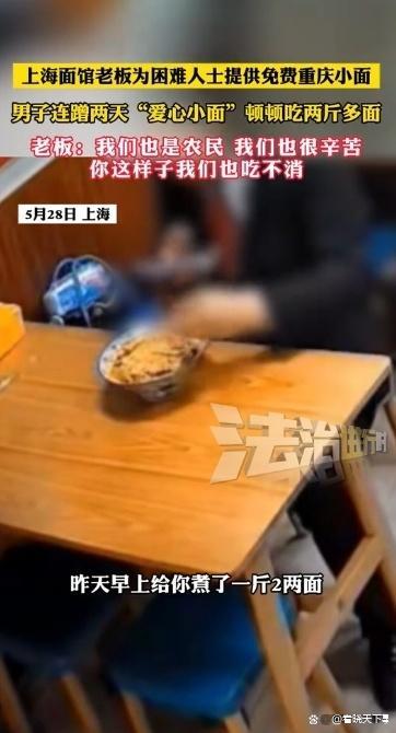 在上海的一家面馆里,老板为了帮助遇到困难的人,推出了免费的重庆小面。只要顾客进店说一句“来碗重庆小面”,就可以免费享用,无需付款。然而,一名穿着西装、打着领带的男子却连续两天来吃,并且每次都要吃二斤。这让老板感到非常困扰。
