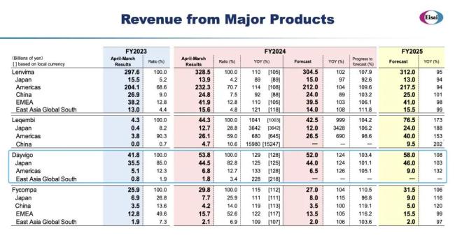 卫材年报显示,莱博雷生2024财年的全球销售额达到538亿日元(折合人民币约26.9亿元),同比增长约28.7%,其中日本本土销售额占比超过82%。随着在中国的商业化进程推进,其销售额有望进一步增长。