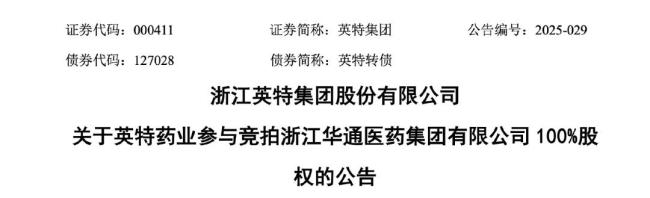5月28日,浙江英特集团股份有限公司发布《关于英特药业参与竞拍浙江华通医药集团有限公司100%股权的公告》,挂牌底价为3.691亿元。