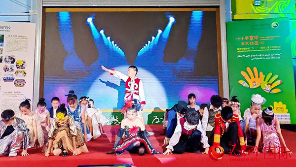 中外嘉宾和孩子们共绘《掌心树影》。人民网 塔里克·易卜拉欣摄