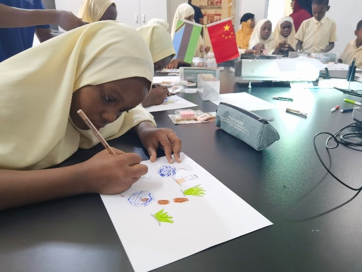 中国援桑血防项目专家组为当地学生开设血吸虫病科普课堂,通过图文并茂的血吸虫病防治宣传册,系统讲解疾病传播途径、症状及防控措施,并分发画笔,邀请学生用绘画表达学习成果。当地学生踊跃参加活动,用画笔展现学到的防病知识。孩子们用稚嫩的笔触描绘出“不接触疫水”“及时就医”等场景,一幅幅充满童趣的画作成为防病知识的生动注脚。
