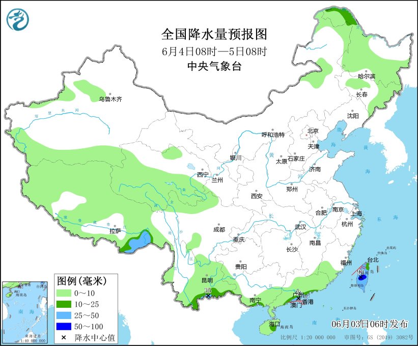 6月3日08时至4日08时,台湾岛、福建东南部、广东南部沿海、海南岛东部、云南西部和中东部、西藏东南部和北部、青海南部、内蒙古东部、黑龙江东部和北部、吉林东部等地部分地区有中到大雨,其中,台湾岛西部的部分地区有暴雨或大暴雨(100~150毫米),西藏东南部、云南东南部、广东南部沿海的局地有暴雨。内蒙古中东部、河北北部等地部分地区有4~6级风。