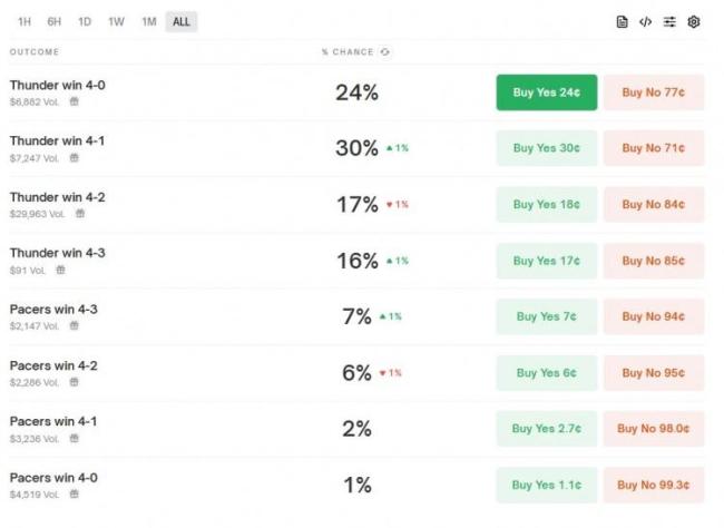 NBA总决赛即将开打,雷霆将对阵步行者。数据媒体Polymarket Hoops发布了系列赛比分的概率预测。