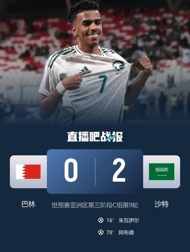 在世预赛亚洲区第三阶段C组第9轮比赛中,巴林主场迎战沙特。上半场,沙特队的朱瓦伊尔率先破门。下半场,沙特再次进球但因越位被判无效,随后阿布德再进一球锁定胜局。最终巴林以0-2不敌沙特。积分榜上,沙特积13分位列第三,巴林积6分排名第五。