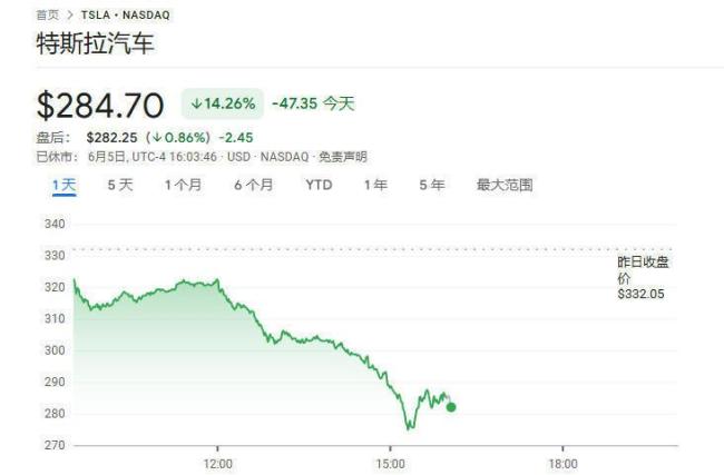 6月5日,特斯拉股价因首席执行官马斯克与美国总统特朗普之间的矛盾公开化而下跌14.26%。据美国有线电视新闻网报道,特斯拉市值因此蒸发超过1500亿美元。