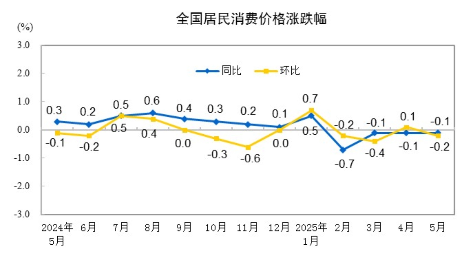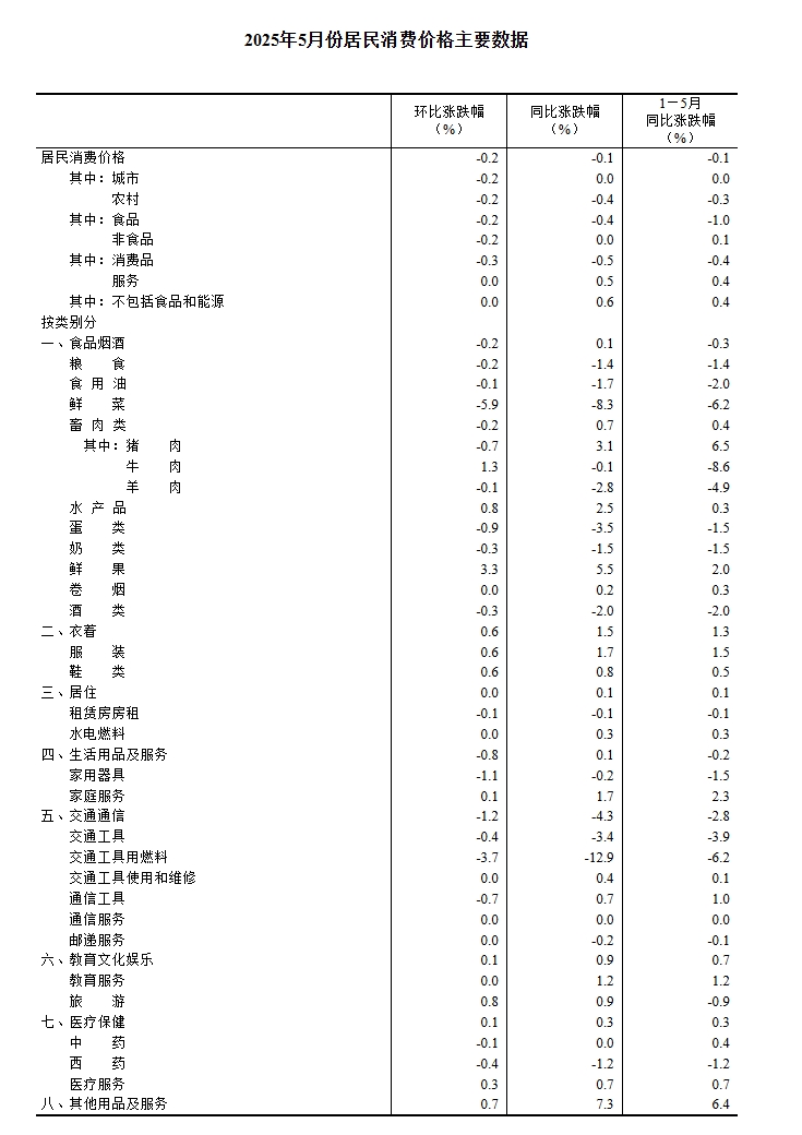 国家统计局:2025年5月份居民消费价格同比下降0.1%