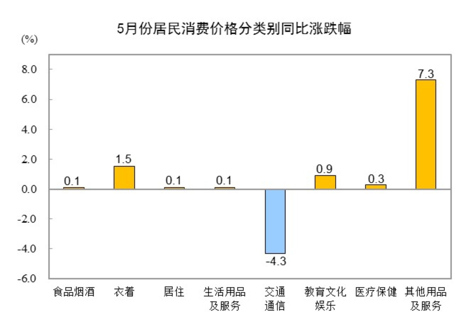 其他七大类价格同比六涨一降。其中,其他用品及服务、衣着、教育文化娱乐价格分别上涨7.3%、1.5%和0.9%,医疗保健、居住、生活用品及服务价格分别上涨0.3%、0.1%和0.1%;交通通信价格下降4.3%。