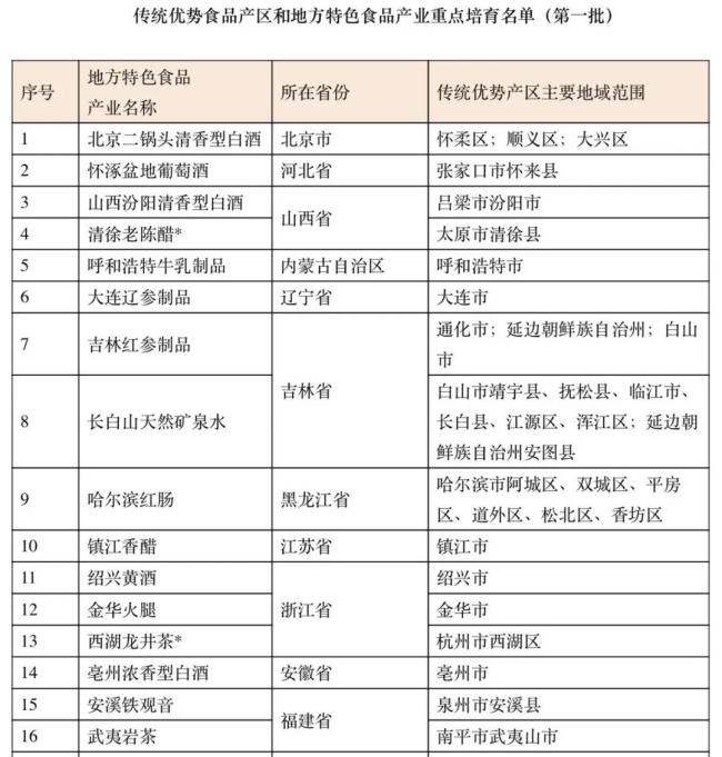6月4日,工业和信息化部发布第一批传统优势食品产区和地方特色食品产业重点培育名单,包括清徐老陈醋、长白山天然矿泉水、镇江香醋、贵州刺梨汁、云南小粒咖啡、赣南脐橙果汁、柳州螺蛳粉等39个重点培育对象,涵盖乳制品制造、饮料制造、酿酒工业、精制茶制造等食品工业主要门类。