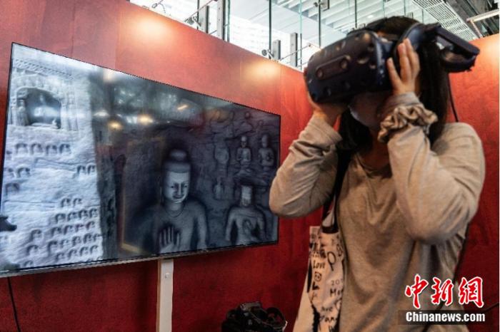 2025年5月27日,“遇见云冈 数字公益艺术展”在香港西九龙高铁站紫荆艺术展览空间亮相。图为一位女士通过AR眼镜体验云冈石窟的魅力。 中新社记者 侯宇 摄