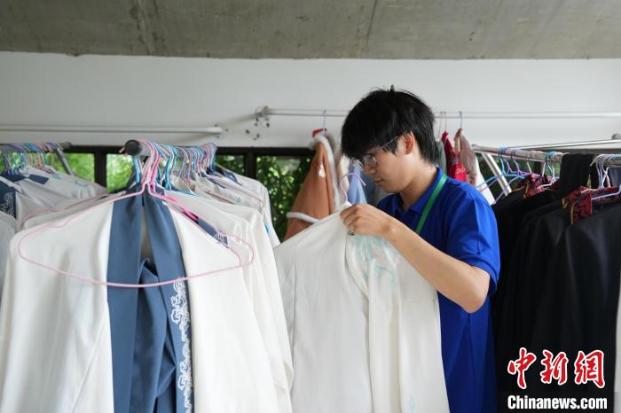 图为10日,一名入乡青年正在整理用于点茶体验所穿的服饰。王逸飞 摄