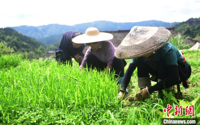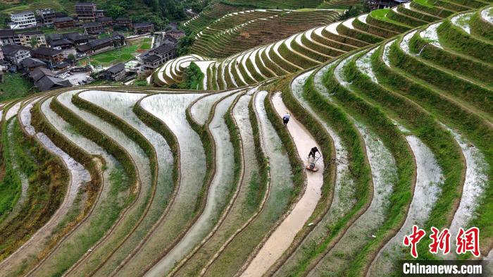 图为村民在梯田上劳作(无人机拍摄)。潘志祥 摄
