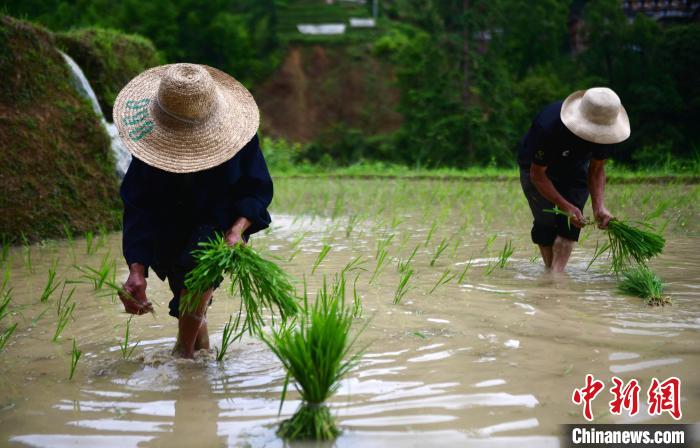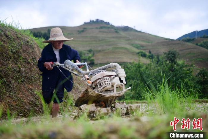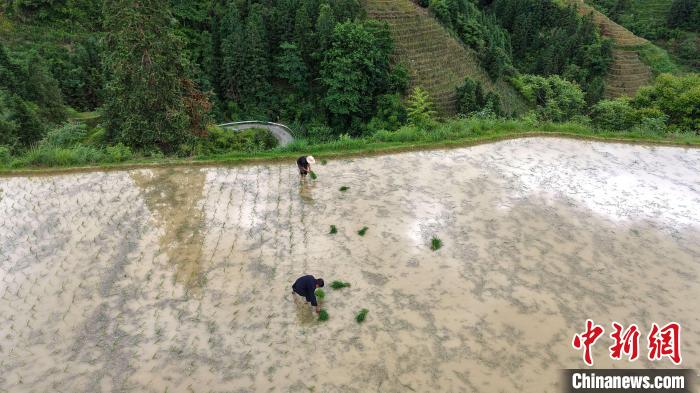 图为村民在梯田上劳作(无人机拍摄)。 潘志祥 摄