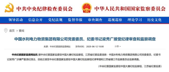 6月12日,中央纪委国家监委官网通报:中国水利电力物资集团有限公司党委委员、纪委书记梁秀广涉嫌严重违纪违法,目前正接受中央纪委国家监委驻中国大唐纪检监察组纪律审查和江苏省镇江市监察委员会监察调查。