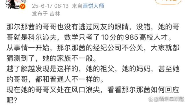 那尔那茜哥哥数学10分!高考数学仅得10分的“天才少年”再次成为娱乐圈热议话题。继那尔那茜以179分考入上海戏剧学院引发争议后,其哥哥科尔沁夫的高考成绩单也被曝光,数学成绩仅为10分,让网友大吃一惊。科尔沁夫如今在音乐圈小有名气,当年却在高考中选择题全选C,最终凭借专业课成绩突出被中央民族大学作曲系录取,堪称现实版“偏科战神”。
