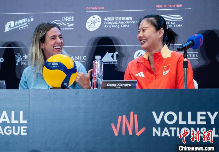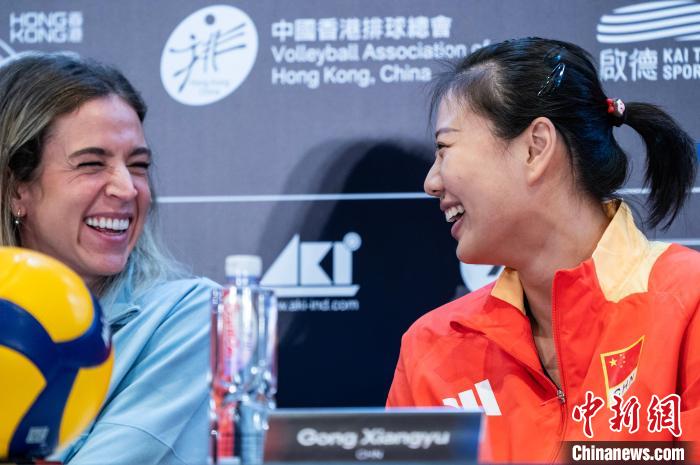 图为中国女排队长龚翔宇(右)在发布会上和捷克队队员海伦娜·格罗泽轻松交流。中新网记者 侯宇 摄