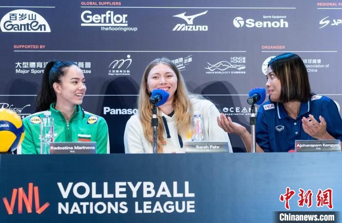 图为保加利亚队队员拉多斯蒂娜·马里诺娃(左)、意大利队队员萨拉·法尔(中)和泰国队队员阿耶查拉蓬·孔育在发布会上会心交流。中新网记者 侯宇 摄
