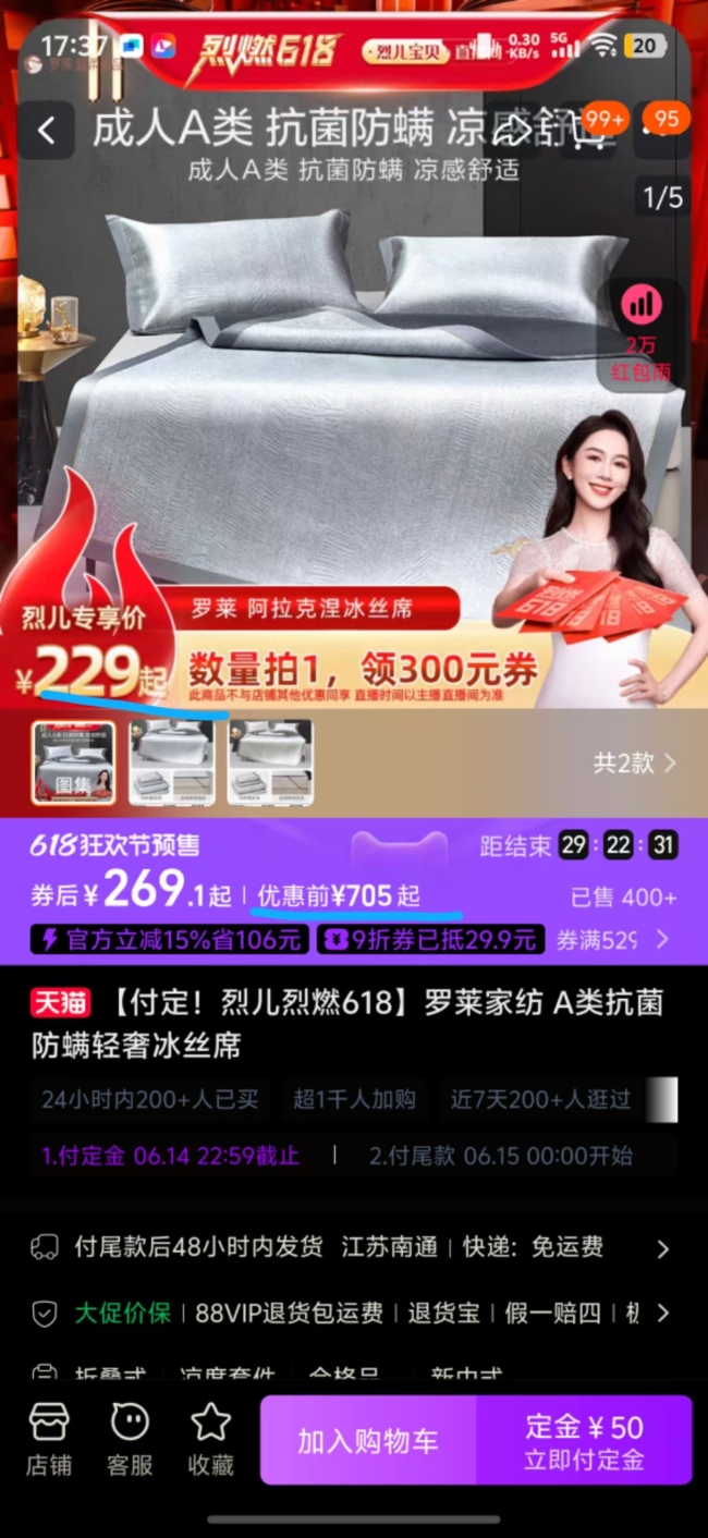 高女士在烈儿宝贝直播间购买罗莱凉席时遇到问题。她发现商品页面上只显示229元起价,但找不到更大尺寸的价格。尝试加购后,页面仅显示预计券后价,优惠券失效后的价格变化让她感到困惑。此外,她还发现同一款商品在另一个链接上有国补,但国补后的价格比普通购买还贵。