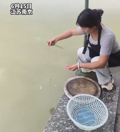 6月15日,江苏南京。女子岸边用一根线挂鱼饵钓鱼,下饵仅10秒便钓到一条大鱼。