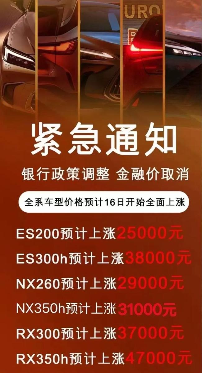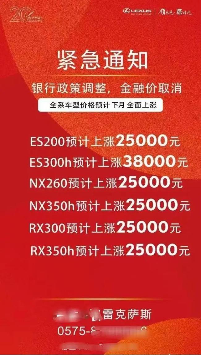 在其他车企价格战打得火热的节骨眼上,雷克萨斯经销商竟然涨价?近日,网上流传着一张雷克萨斯的涨价海报。海报内容显示,因银行政策调整金融价取消,全系车型价格预计下月全面上涨。其中,ES200、NX260、NX350h、RX300、RX350h预计上涨2.5万元;ES300h预计上涨3.8万元。这一涨价消息传出后,立即引起热议。