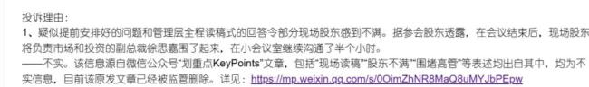 然而,据自媒体《划重点》公开报道称,有参会股东透露,疑似提前安排好的问题和管理层全程读稿式的回答令部分现场股东感到不满。在会议结束后,现场股东将负责市场和投资的副总裁徐思嘉围了起来,在小会议室继续沟通了半个小时。不过,代表美团方面的北京三快科技有限公司向《华尔街科技眼》发布的撤稿函称,该内容不实,美团已经通过监管,完成了对《划重点》的删稿。