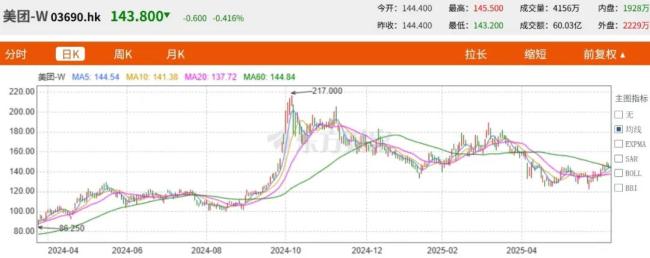 截至6月11日,美团港股收盘价143.8港元/股,较前日小幅下跌0.42%。相较2024年10月最高217元的高位,跌去了34%左右。