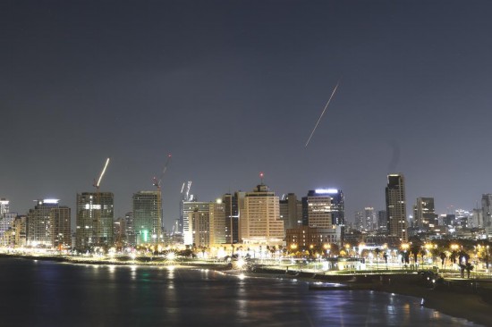 6月19日凌晨,在以色列特拉维夫,防空系统发射拦截弹留下光亮的轨迹(画面右侧)。 新华社发(贾马尔·阿瓦德摄)