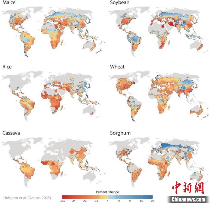 中新网北京6月20日电 (记者 孙自法)国际知名学术期刊《自然》最新一期发表一篇气候变化建模论文发现,大部分主食作物可能会因气候变化出现严重产量损失,即使考虑了限制气候变化影响的缓解措施依然如此。这项研究评估了玉米、大豆、水稻、小麦、木薯和高粱6种主食作物,发现只有水稻或许能避免严重损失。