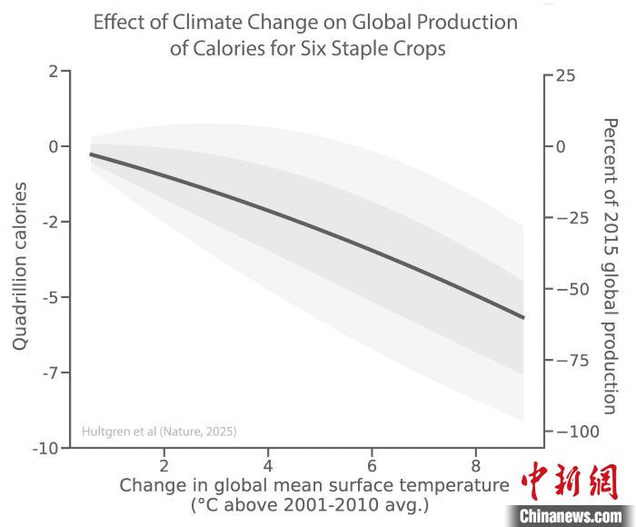 论文作者研究估计,气温比工业化前水平每升高1°C,每人每天的产量就会下降120卡路里,相当于当前每日消耗量的4.4%。他们认为,在高排放情景下,美国、中国东部、亚洲中部、非洲南部、中东到21世纪末的玉米产量可能最多下降40%,欧洲、非洲、南美的小麦损失为15%-25%,中国、俄罗斯、美国、加拿大的小麦损失为30%-40%。他们还指出,与无适应措施情景相比,收入增长和实施适应策略或使全球损失到2050年减少23%,到2100年减少34%。