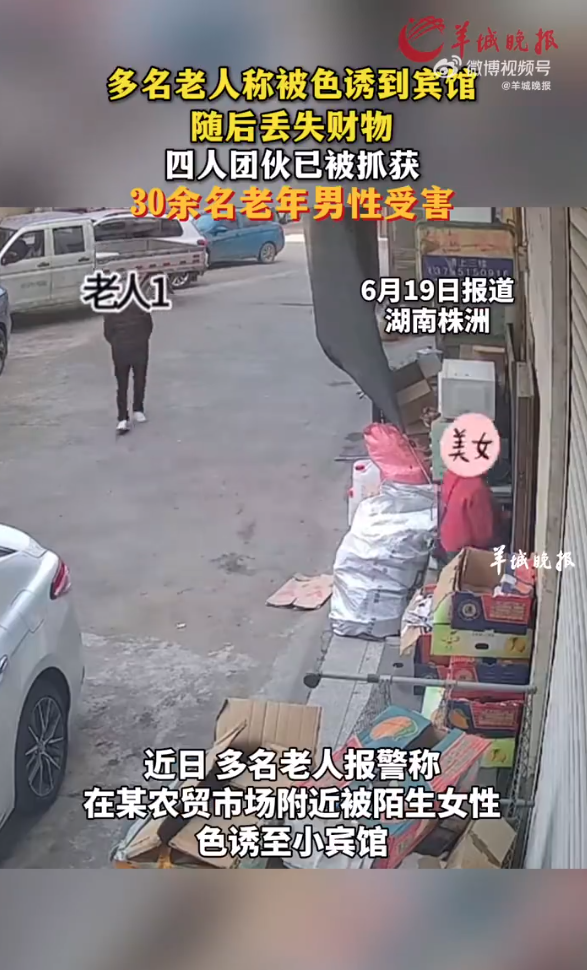 6月19日湖南株洲。近日,多名老人报警称,在某农贸市场附近被陌生女性色诱至小宾馆,进入宾馆房间后,金戒指、现金等财物丢失。