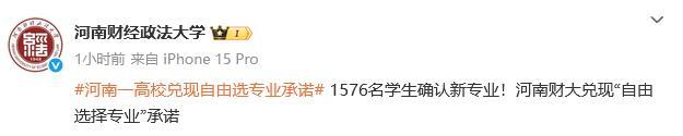 河南高校兑现自由选专业承诺!6月19日,河南财经政法大学宣布兑现“自由选择专业”的承诺。在2024级6403名本科生中,1588人申请转专业,最终1576人成功转入自己选择的新专业,实现了学业生涯规划的重要一步。