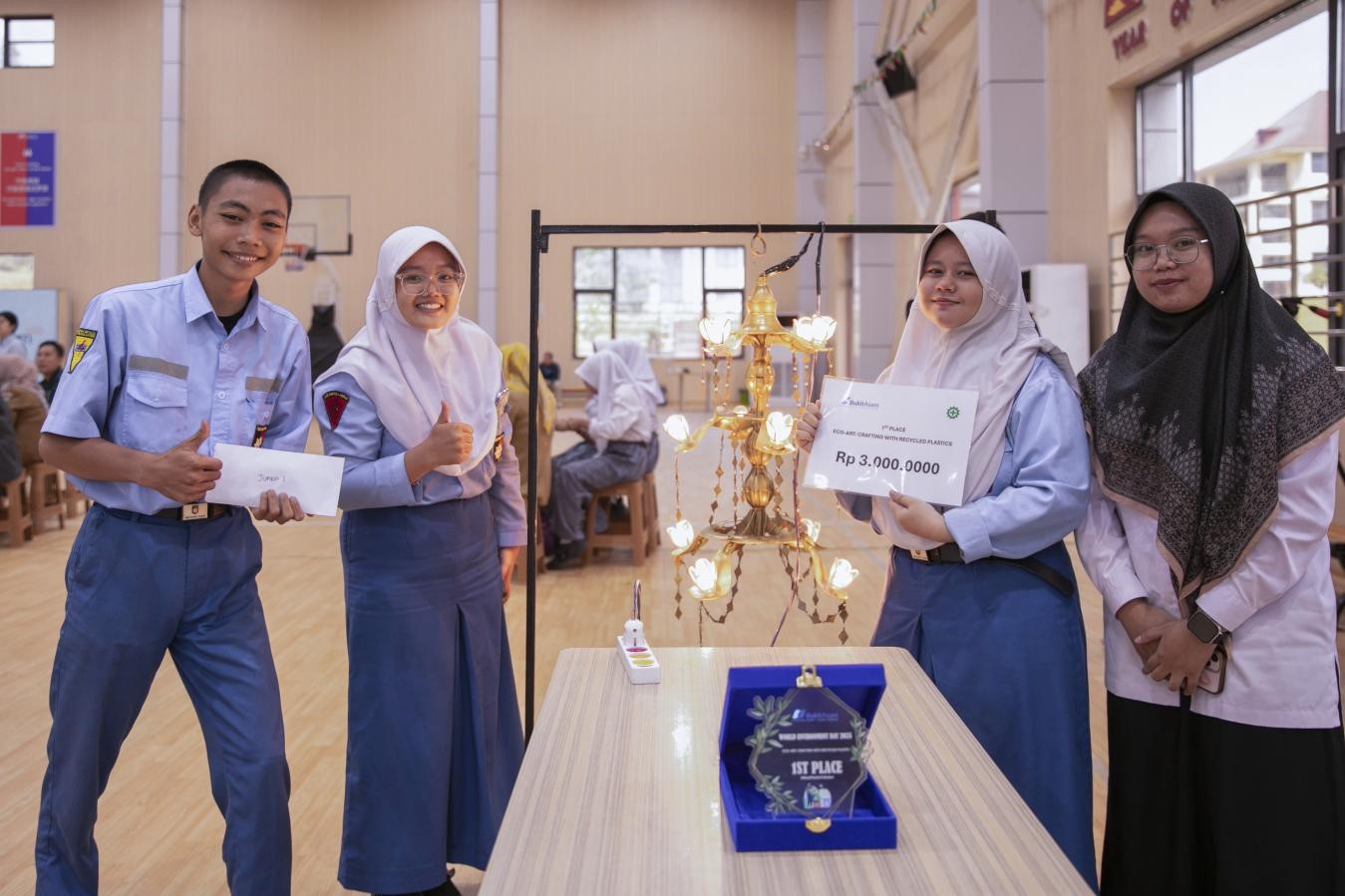 公司评审团从创意性、实用性、环保理念等维度综合考虑,最终评选出一、二、三等奖各1名。其中,布基特·阿萨姆职业高中的“点亮未来”吊灯荣获一等奖;拉旺·基杜尔一号高级中学的“海纳百川”凳子斩获二等奖;穆拉·埃尼姆一号高级中学的“海洋蓝与华电蓝”桌子荣获三等奖。一名获奖学生感慨道:“原来垃圾也能变废为宝。我们呼吁更多人减少浪费,关注塑料污染与环境保护。”