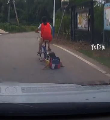 姐姐骑车过减速带后座妹妹被颠掉 后方司机立即鸣笛提醒