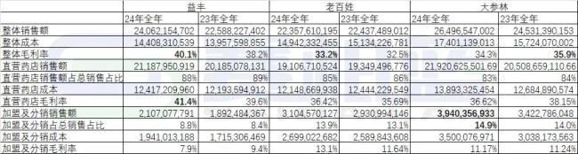 首先分析2023年-2024年两年间三家上市连锁药店的整体、直营药店、加盟和分销三个层面的销售额、毛利率。益丰是整体销售、毛利额、毛利率三增;老百姓营收持平,毛利额略增,毛利率略增;大参林整体销售增加,毛利额略增,毛利率下降。