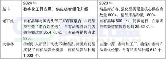 三家上市公司过去2年分别针对自有品牌做了如下工作:益丰在2023年核心供应商数量突破600+,精品库产品品种数1800+,在24年他们虽然没有在财报里阐述具体数据,但是根据前文的毛利率提升,推测其24年应该比23年更好。