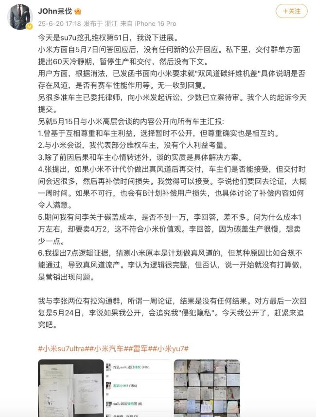 目前,根据法律,维权用户已发函书面向小米要求就“双风道碳纤维机盖”具体说明是否存在风道,是否有赛车性能作用等。无一收到回复。