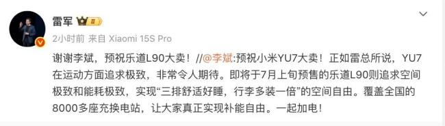 而当天晚些时候,李斌也发文强调,YU7在运动方面追求极致,而乐道L90则追求极致空间和极致能耗。李斌还提到,乐道L90即将在7月上旬开启预售,并且蔚来已经在全国覆盖8000多座充换电站。乐道L90是一款大型纯电SUV,分别有6座和7座可选,该车搭载900V全域高压架构,搭载340kW单电机或100+340kW双电机。换电是乐道的护城河,但也并不是完全隔绝了小米YU7。